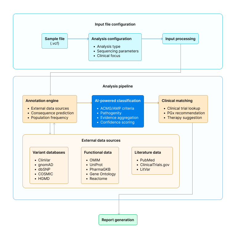 This isn't about replacing clinical expertise. A platform doesn't make diagnostic decisions, clinicians do. What it does is collapse the weeks of annotation, database cross-referencing, and evidence gathering into a structured starting point, so the clinician's time goes toward the judgment calls that actually require their training.
